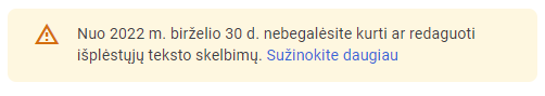 Po 2022 m. birželio 30 d. nebegalėsite kurti arba redaguoti išplėstųjų teksto skelbimų. Tačiau esami išplėstieji teksto skelbimai ir toliau bus rodomi. Prireikus skelbimus galėsite pristabdyti, atnaujinti arba pašalinti.