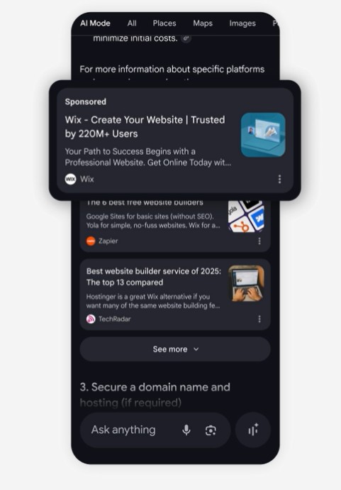 Na o dabar ruošiamasi dideliam pokyčiui reklamos srityje – reklama bus integruota į AI režimą, kuris pakeis tradicinį paieškos modelį. Šis žingsnis žymi svarbų posūkį, kai reklama tamps neatsiejama nuo pokalbių su dirbtiniu intelektu. Pagal naujausią informaciją, AI režimas bus išplėstas iki 2025 metų ketvirto ketvirčio, o reklamos bus rodomos ne tik pagal vartotojo užklausą, bet ir pagal visą AI pokalbio kontekstą (šaltinis).